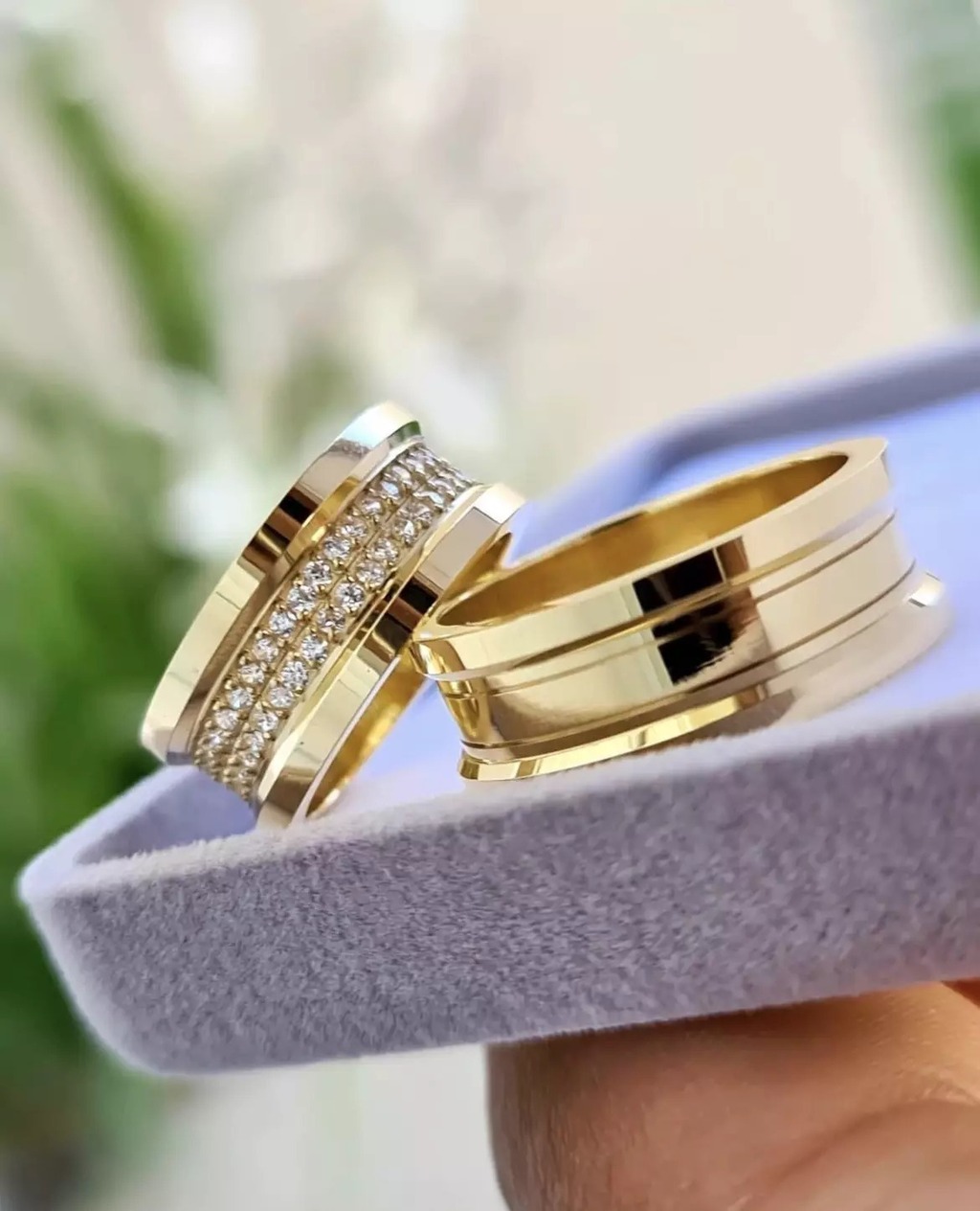Nossas alianças são confeccionadas com moedas douradas de 1945, garantindo durabilidade e resistência ao longo da vida. Elas não ficam prateadas nem desbotam!